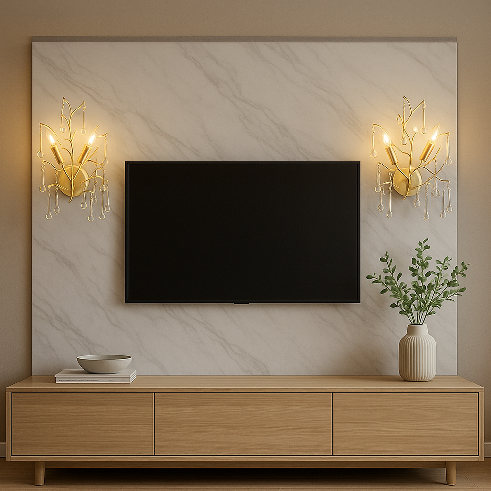 Aplica de perete cu cristale K9 impresioneaza prin designul sau rafinat si detaliile elegante, fiind o piesa de decor care atrage toate privilegiile. Finisajul auriu al structurii metalice si cristalele stralucitoare creeaza un joc spectaculos de lumina, ideal pentru a adauga un stil sau un plus de lux si spatiu.