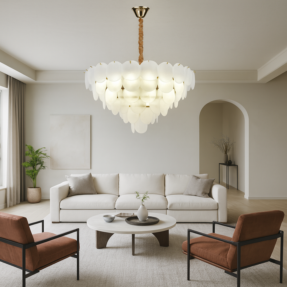 Candelabrul 5867-750 TB este o piesa decorativa impunatoare, realizata din elemente de sticla mata suprapuse in straturi elegante. Cu diametrul mare de 75 cm si iluminare generoasa, acest model este perfect pentru livinguri ample, holuri inalte sau zone de dining cu accent premium.