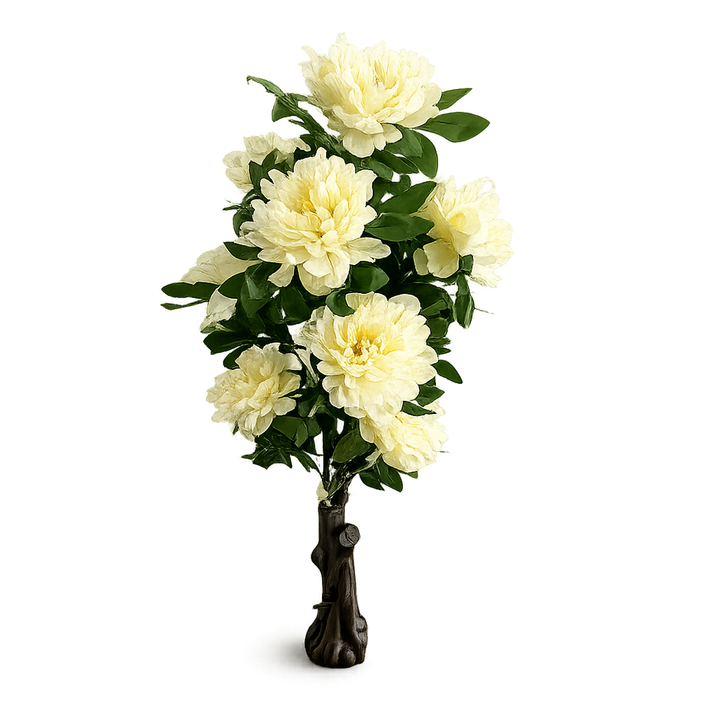 Copac artificial impresionant cu bujori mari, cu infatisare luxurianta si romantica. Cu o inaltime de 140 cm si o coroana bogata de bujori artificiali voluminosi, aceasta piesa decorativa transforma orice spatiu intr-un cadru elegant si rafinat.