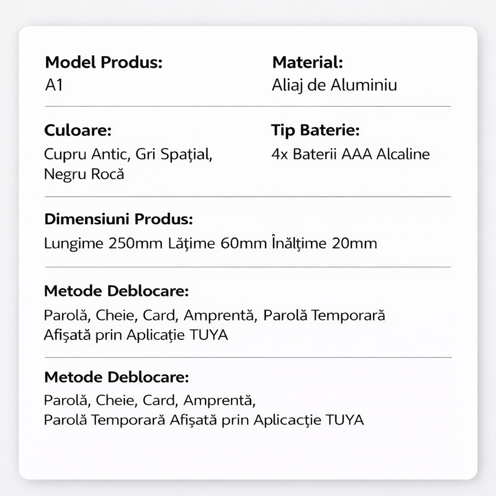 | Metode de acces | 5 (amprenta, PIN, card, Tuya, cheie) |